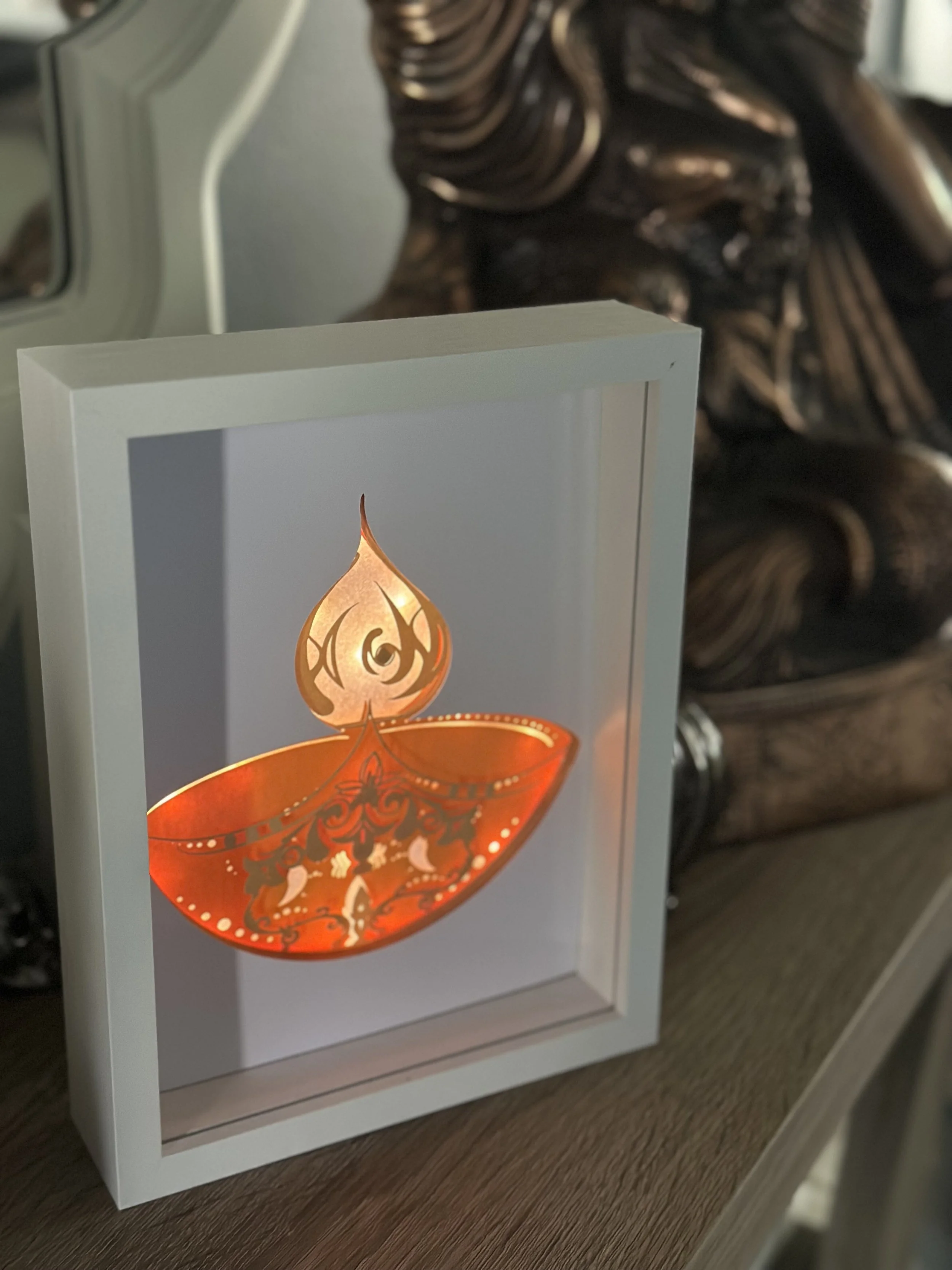 Single white or gold/color decorative light box for Diwali. The handmade light box diya design has an elegant look that can be blended with Fall/Autumn decor for any American Desi home. Battery powered LED fairy lights with on and off switch, which is on the back of the frame.